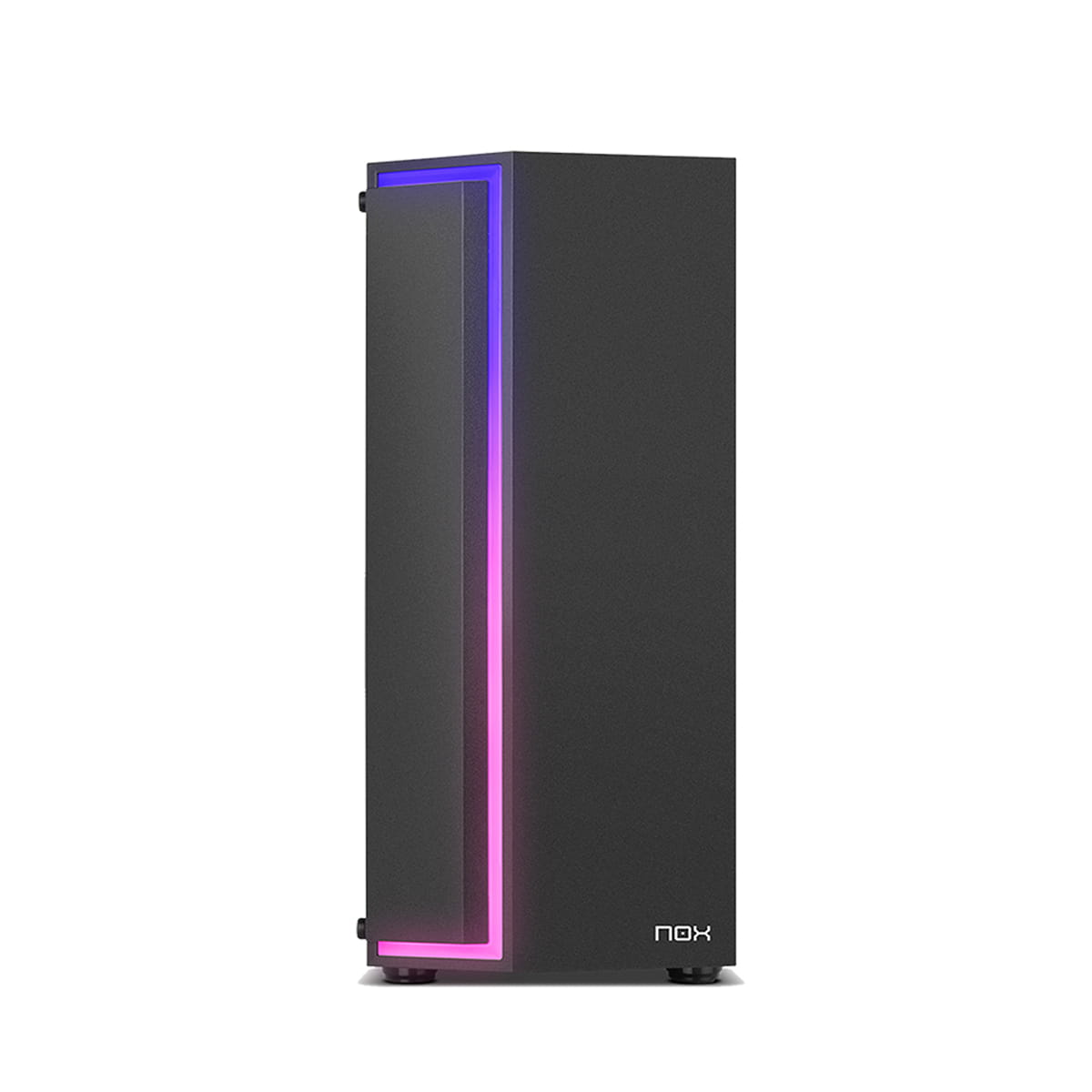 El equipo se presenta en la torre Nox Infinity Gamma ARGB Cristal Templado USB 3.0, que ofrece un diseño elegante, buena ventilación y una ventana lateral que permite ver el interior del equipo. Incluye iluminación ARGB para un toque moderno.